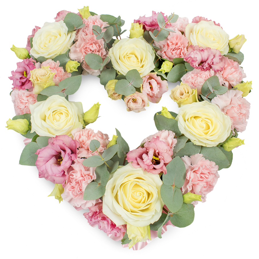 Share your heartfelt emotions with our Timeless Heart Floral Arrangement. This exquisite bouquet combines white roses, pink carnations, pink lisianthus, and eucalyptus leaves, meticulously arranged into a beautiful heart shape that symbolizes enduring love and remembrance.